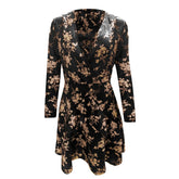 Women's long-sleeved Bohemian print low-cut V-neck lace-up dress