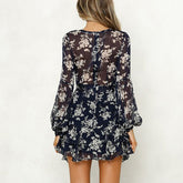 Low Cut V Neck Sexy Dress Flared Long Sleeve Lace Dress Bohemian Print Lace Up Summer Dresses Qutfits Ultra-Thin Dresses