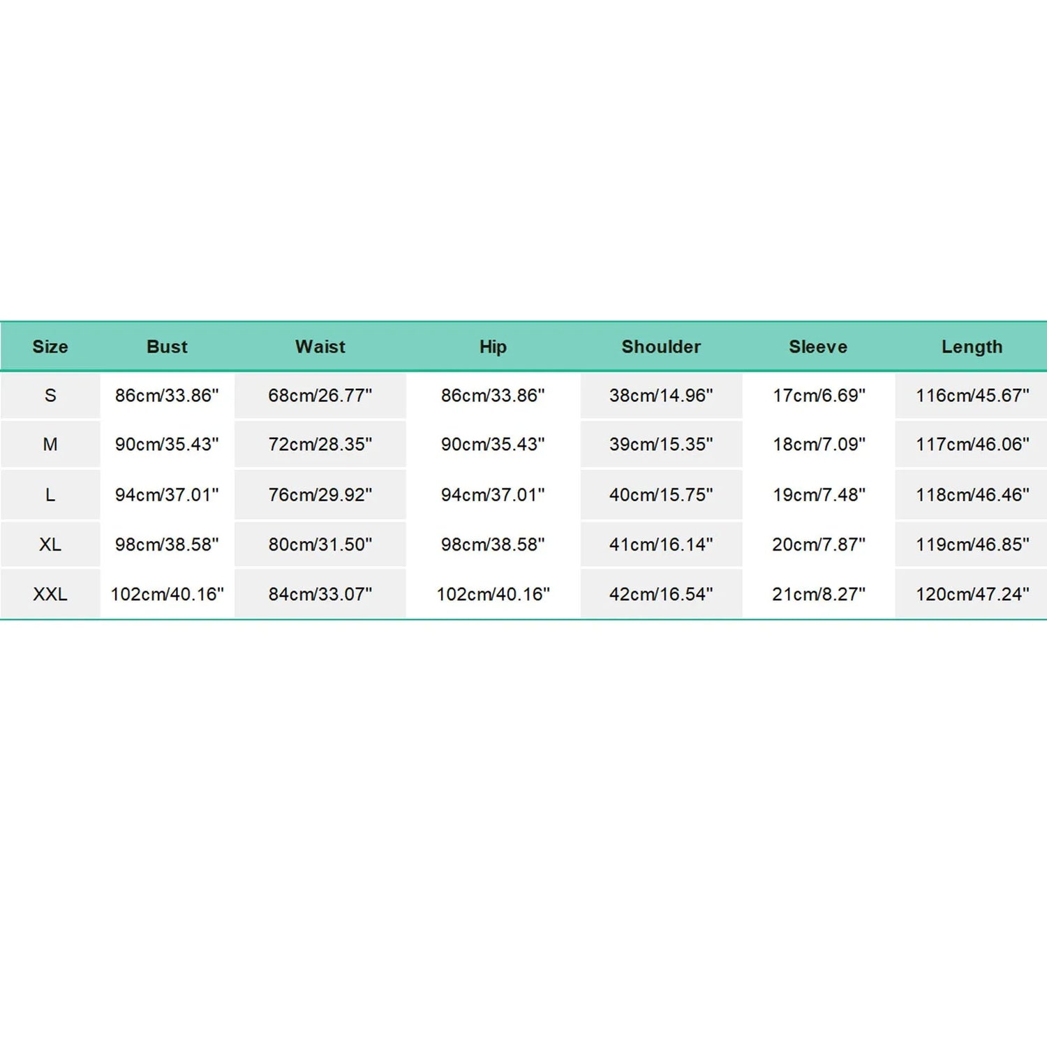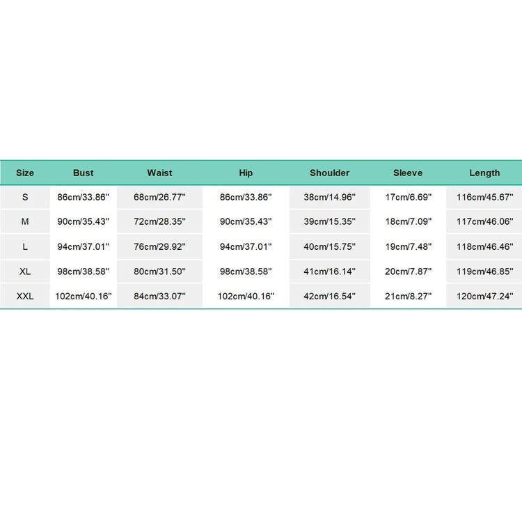 Size:XXL bust:102cm/40.16'' Waist:84cm/33.07'' Hip:102cm/40.16'' Shoulder:42cm/16.54'' Sleeve:21cm/8.27'' Length:120cm/47.24''