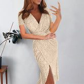 Sexy Deep V Sequins Wrap Dress Womens Ruched Short Sleeve Formal Party Dresses Sparkly Evening Gown Wedding Guest Dress Vestidos