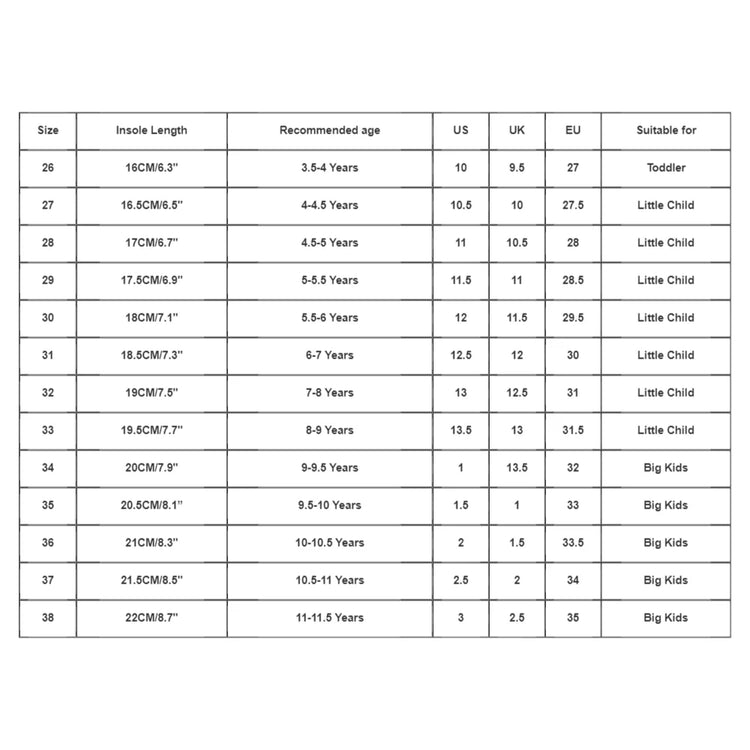 Size:33 | Insole Length :19.5CM/7.7" | Recommended age :8-9 Years | US:13.5 | UK:13 | EU:31.5 | Suitable for:Little Child |