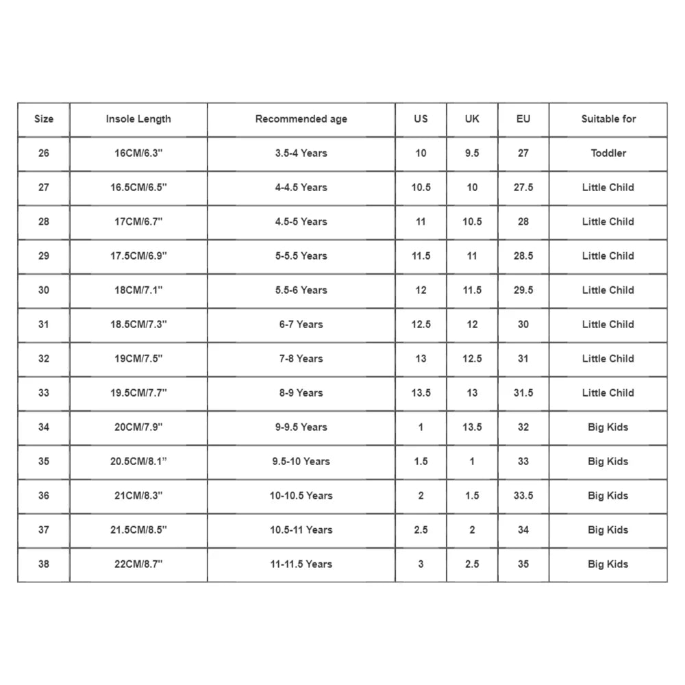 Size:35 | Insole Length :20.5CM/8.1” | Recommended age :9.5-10 Years | US:1.5 | UK:1 | EU:33 | Suitable for:Big Kids |
