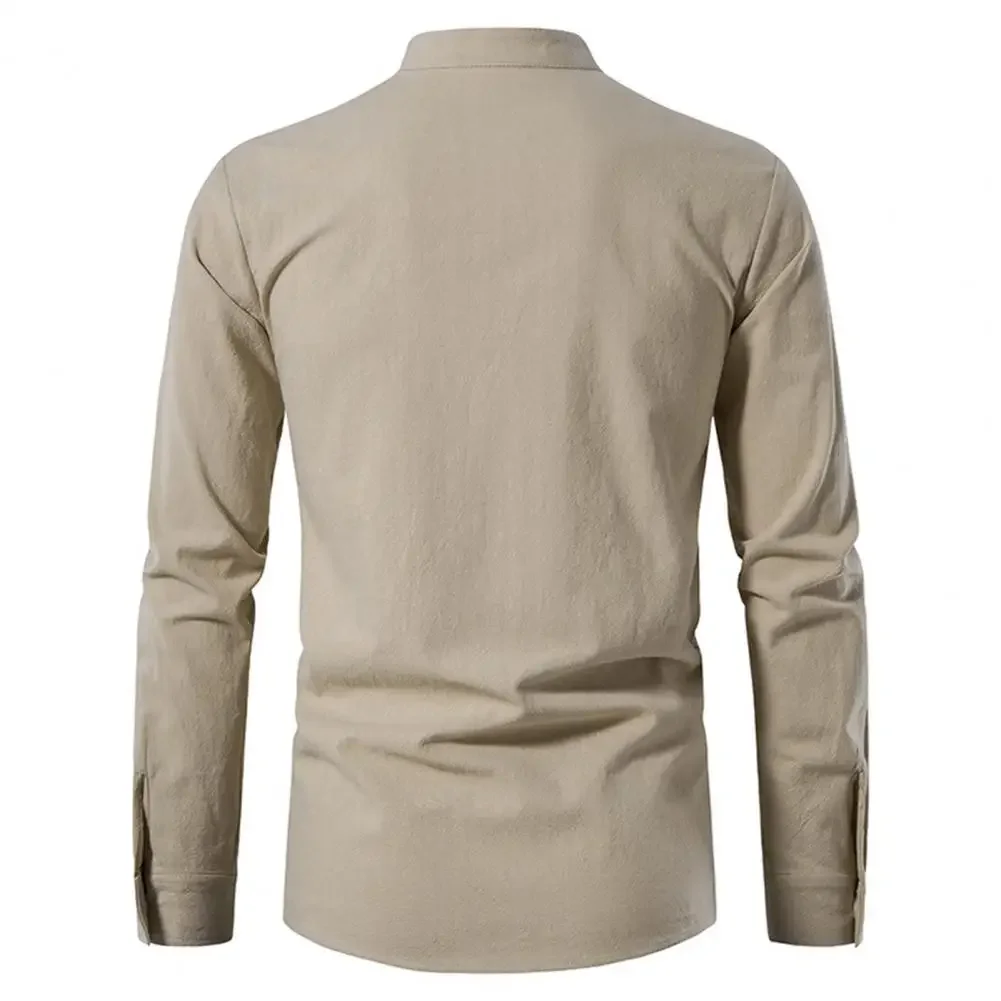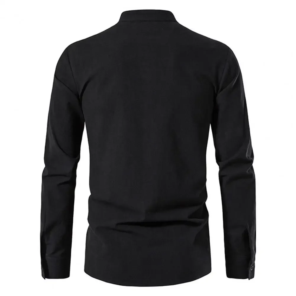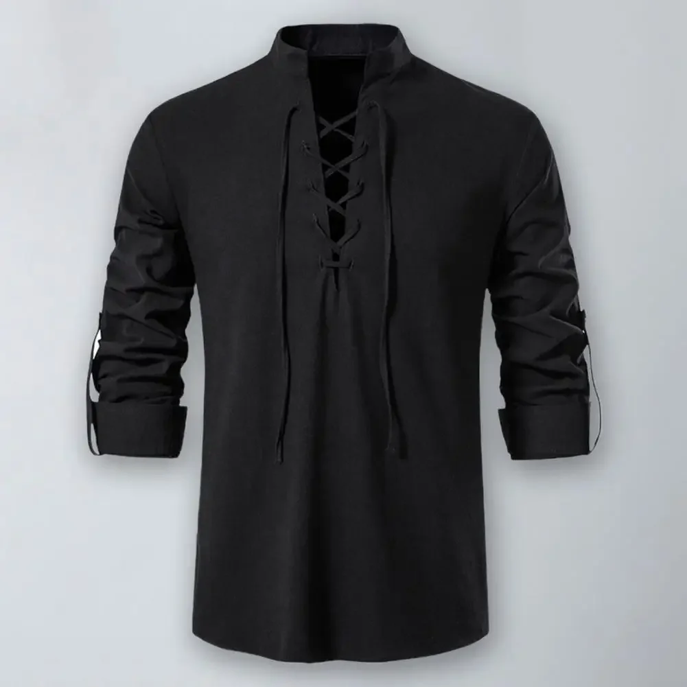 Stand Collar Cross Lace-up Men Shirt Long Sleeve Moisture-wicking Anti-pilling Solid Color Slim Casual Top Streetwear
