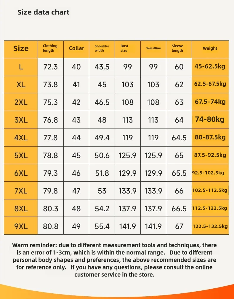 size_info: {"sizeInfoList":[{"length":{"cm":"104","inch":"40.94"},"size":"L","vid":-3},{"length":{"cm":"108","inch":"42.52"},"size":"XL","vid":-4},{"length":{"cm":"112","inch":"44.09"},"size":"XXL","vid":-5},{"length":{"cm":"116","inch":"45.67"},"size":"3XL","vid":-6},{"length":{"cm":"118","inch":"46.46"},"size":"4XL","vid":-7},{"length":{"cm":"122","inch":"48.03"},"size":"5XL","vid":-8},{"length":{"cm":"124","inch":"48.82"},"size":"6XL","vid":-9},{"length":{"cm":"126","inch":"49.61"},"size":"7XL","vid":-10},{"length":{"cm":"130","inch":"51.18"},"size":"8XL","vid":-71}]}