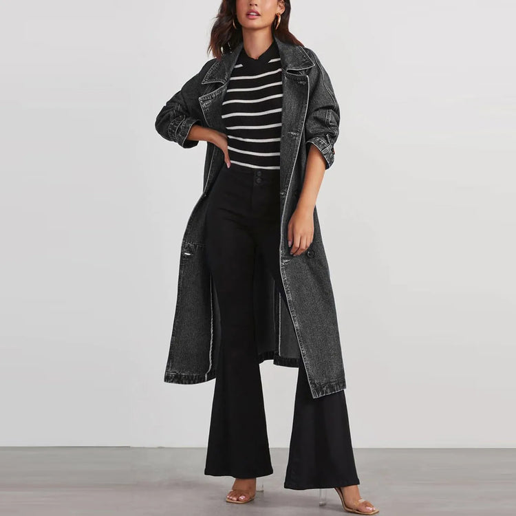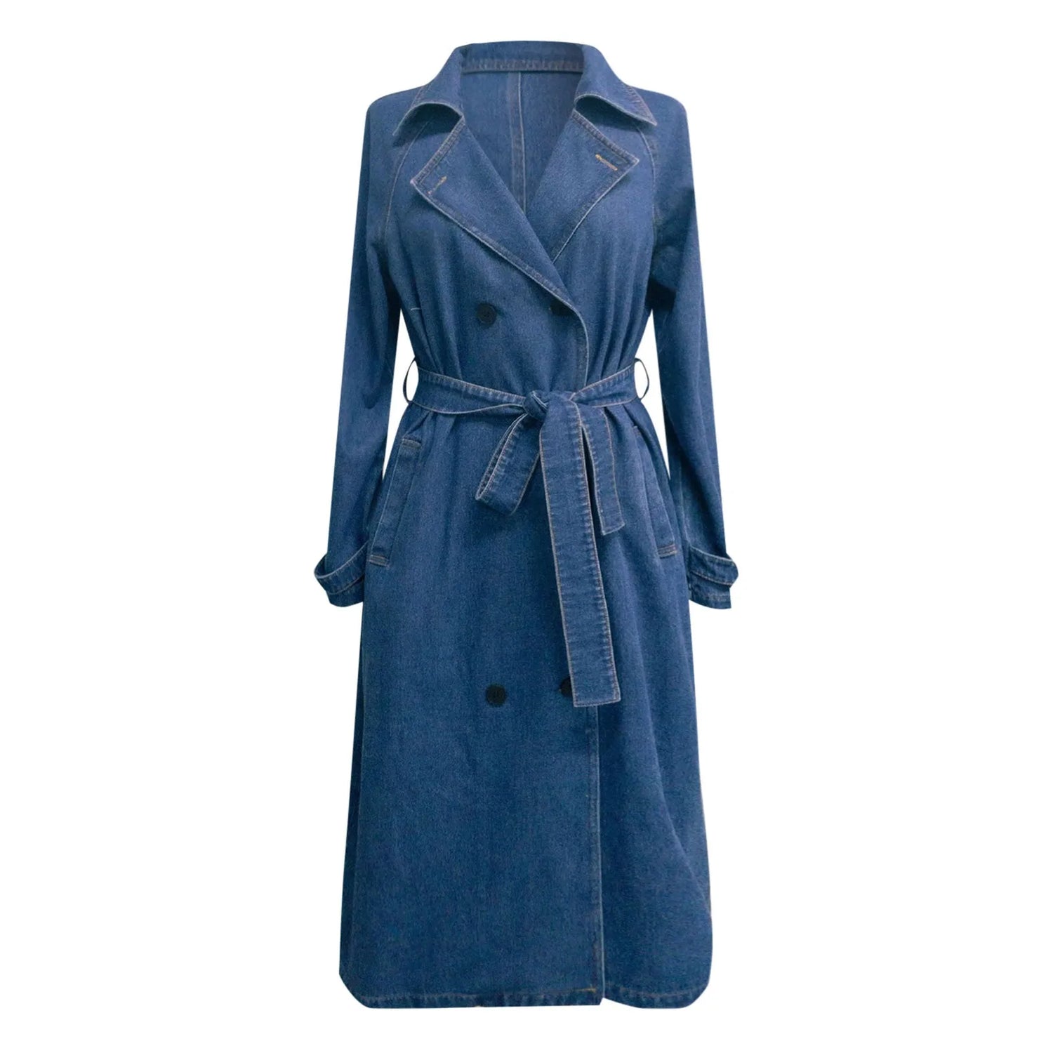 Women'S Vintage Long Jean Jacket Temperament Loose Fit Double Breasted Denim Jacket Lapel Trench Coat With Belt Woman Clothing