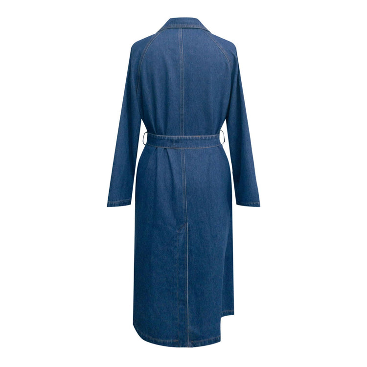 • Vintage long denim jacket for women, featuring front double breasted button up closure, classic notch lapel, 2 slanted side entry pockets for your hands, blow the knee length.