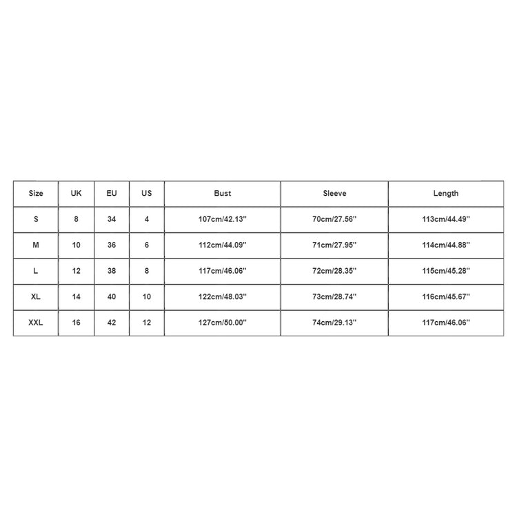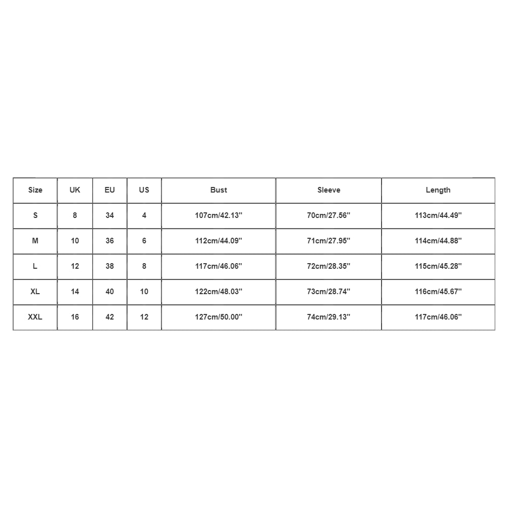 Size:XL UK:14 EU:40 US:10 Bust:122cm/48.03'' Sleeve:73cm/28.74'' Length:116cm/45.67''