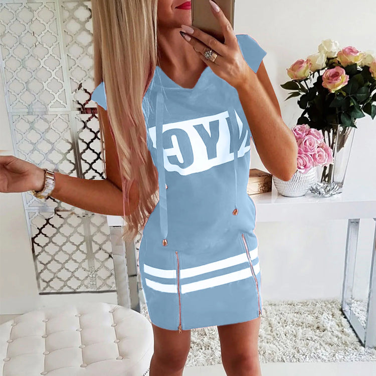 Women Fashion Pullover Zipper Hooded Print Slim Fit Loose Short Sleeve Dress