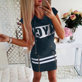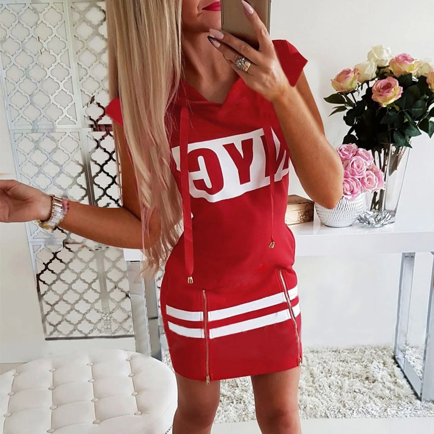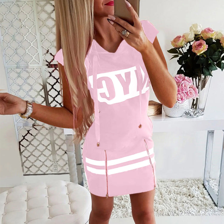 Women Fashion Pullover Zipper Hooded Print Slim Fit Loose Short Sleeve Dress