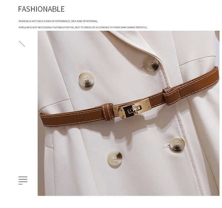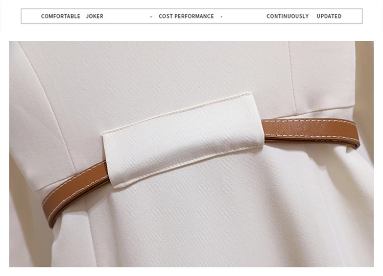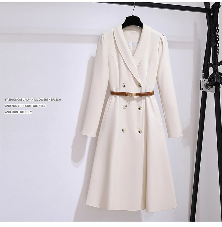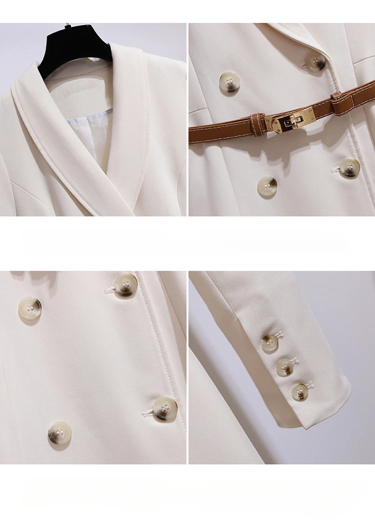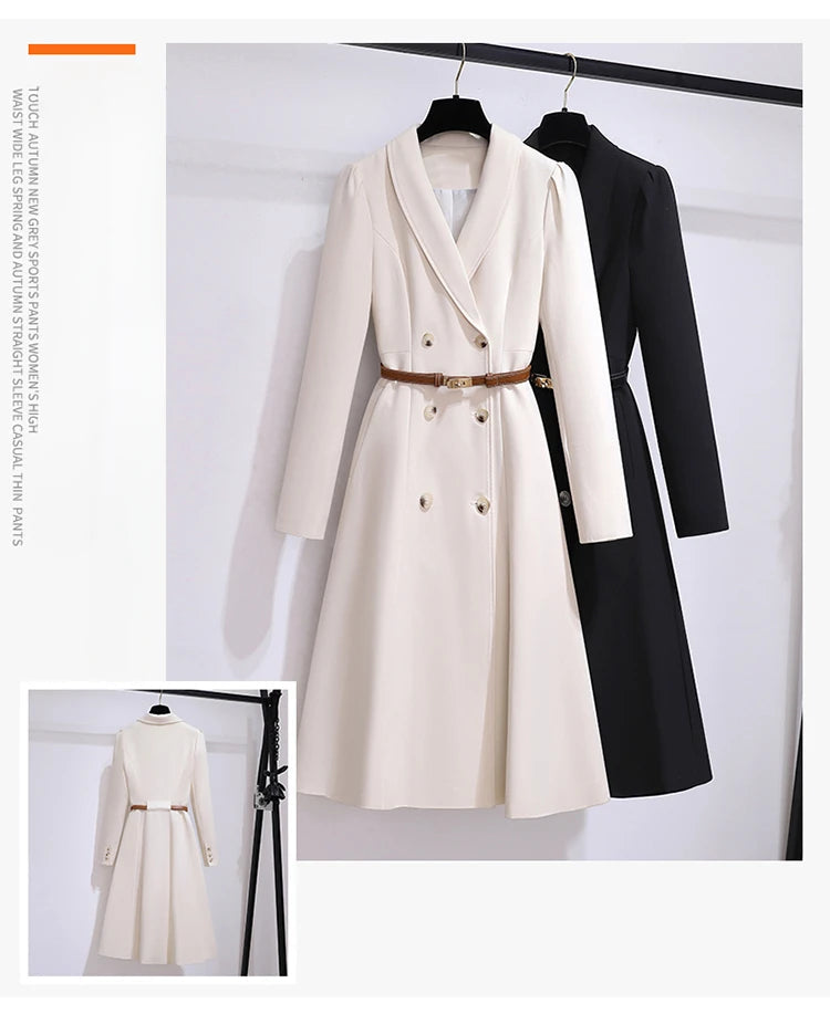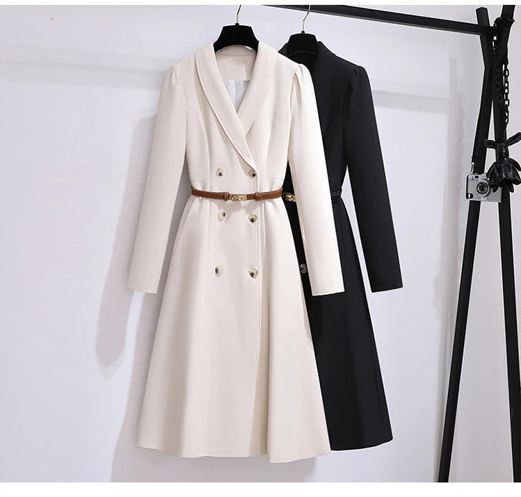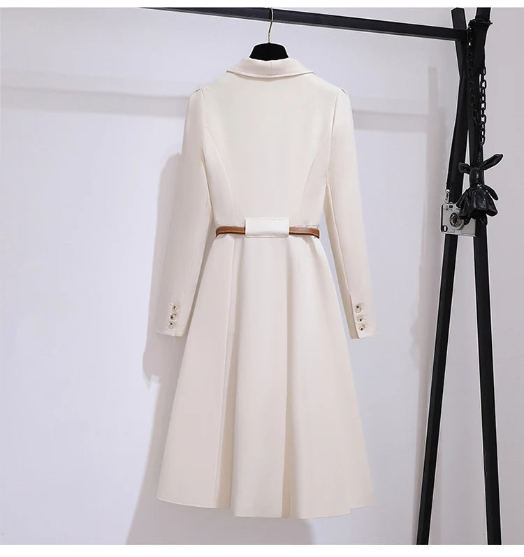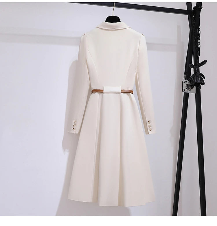 Women's Dress Double Breasted Elegant Dresses for Women 2025 Autumn Off white Dress Belt Knee-Length Solid Fashion Woman Clothes